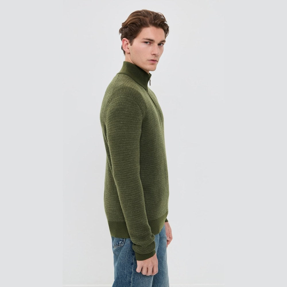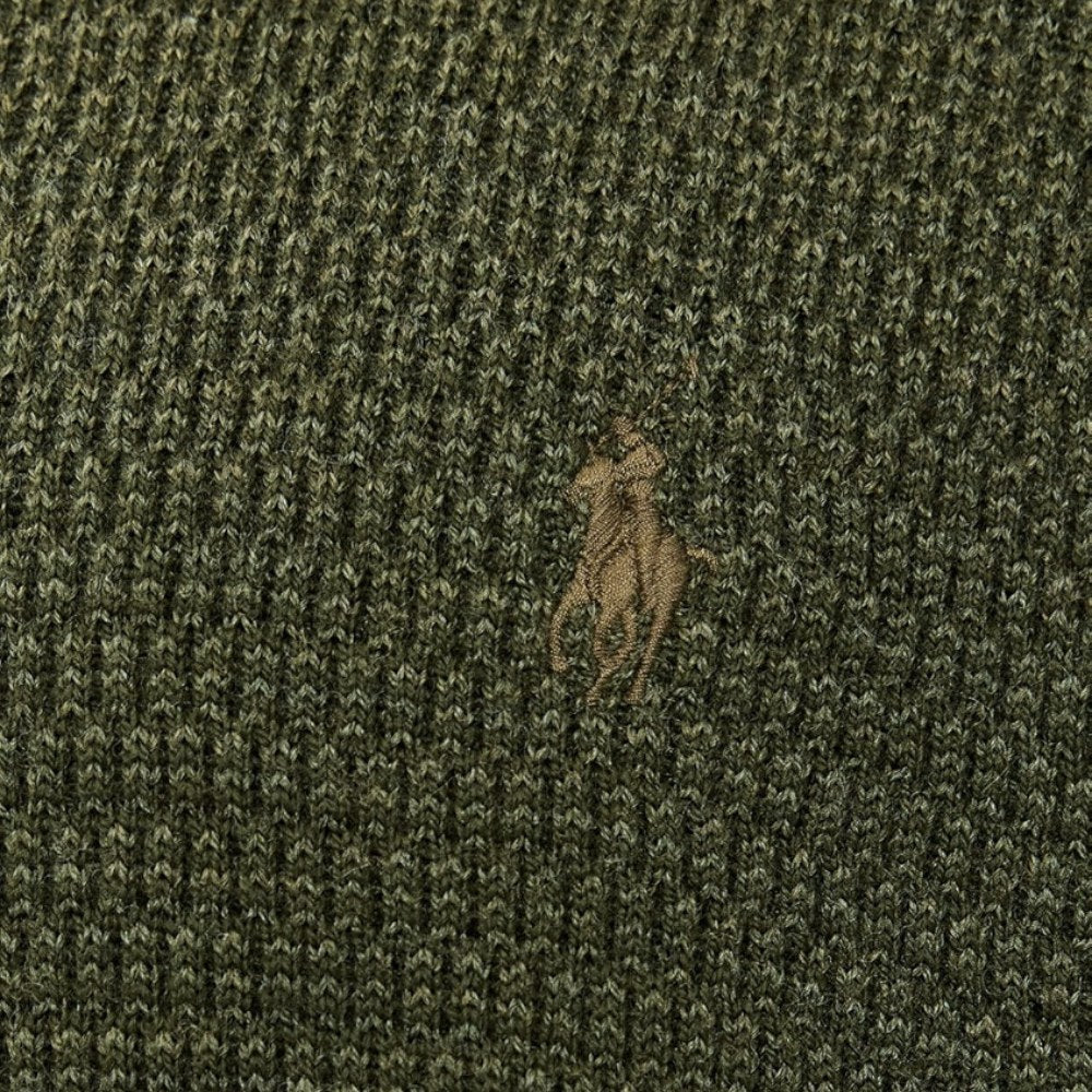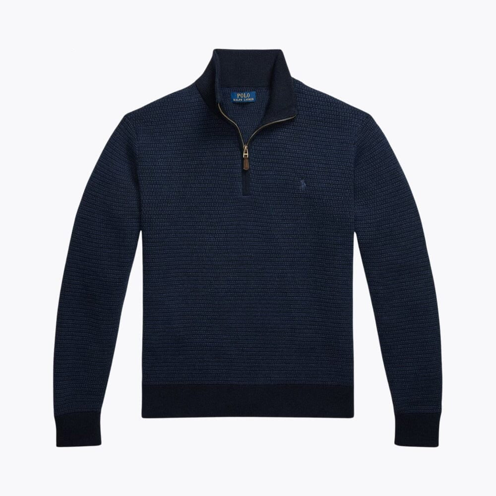 - Rib-knit mockneck. Quarter-zip front. Suede zip pull custom-developed with a RL logo.