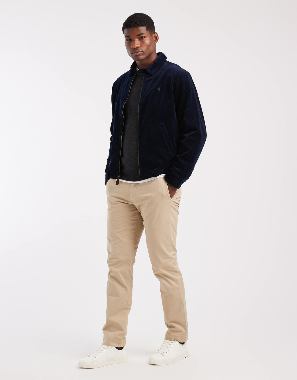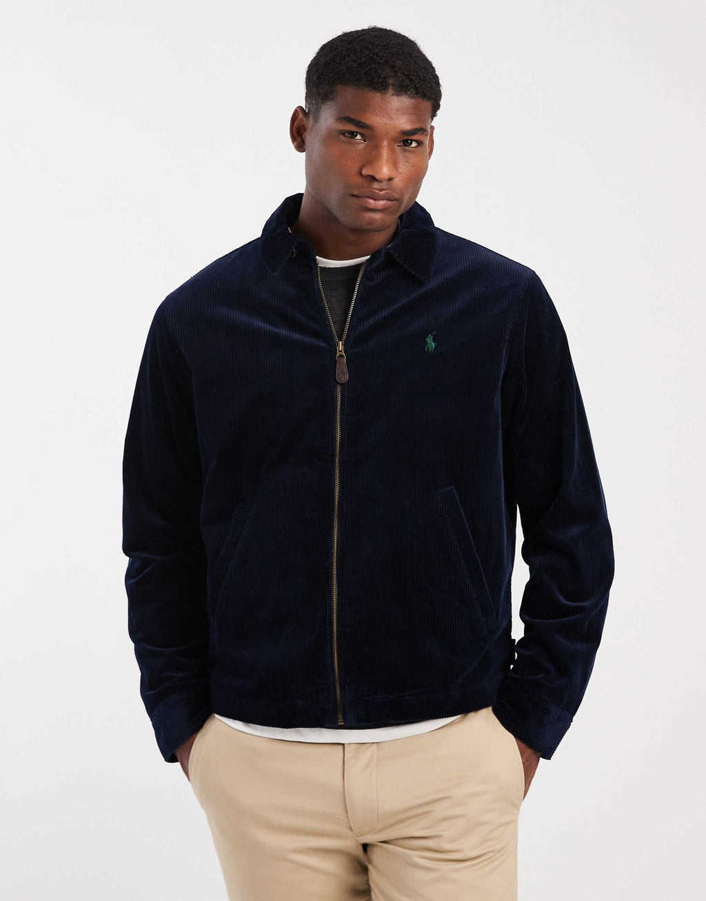 - Corduroy point collar. Throat latch with a snapped closure. Full-zip front. Leather zip pull. Snapped storm placket. Metal snaps custom-developed with a RL logo.
